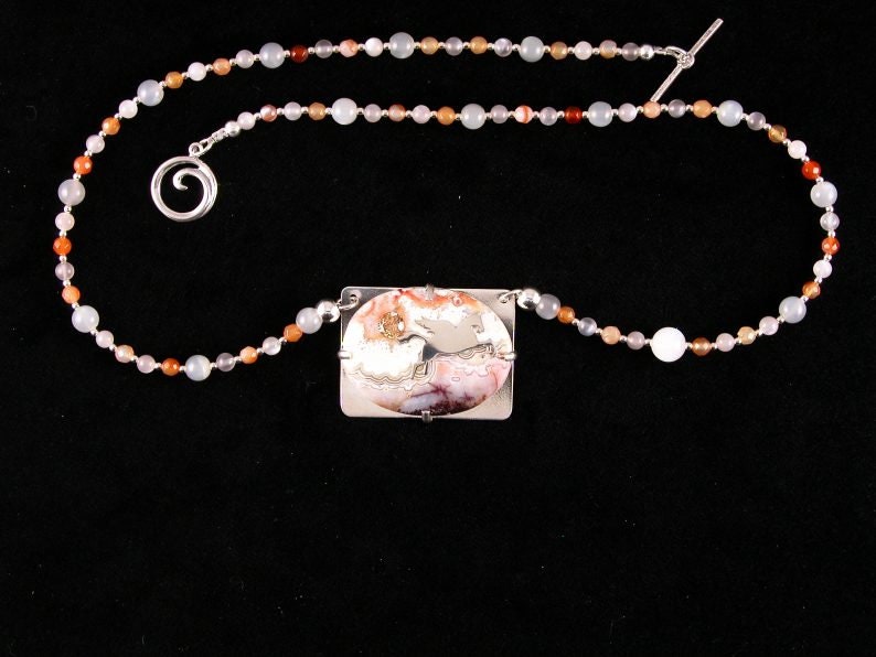MW1554 Sterling cut out Pegasus on Mexican crazy lace agate set in sterling with faceted carnelian cab sun accent inset into stone on necklace of moonstone and sterling spacer beads with sterling toggle clasp