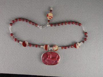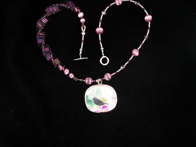 MW0861 Chinese pottery pendant with sterling bird strung on necklace of cat’s eye and silver seed beads with “DNA” segment accent and sterling toggle clasp