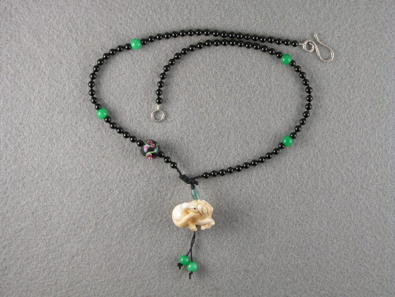 MW3049 Hand-carved buffalo bone reclining horse on necklace of onyx beads and jade beads with glass black bead with pink flower accent and sterling hook and eye clasp