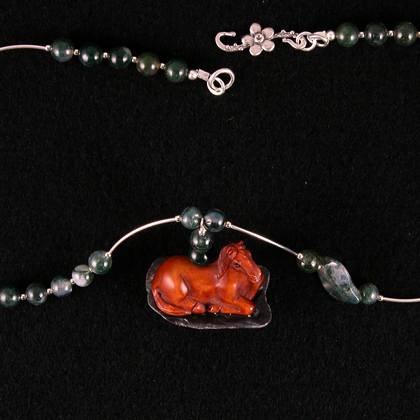 Boxwood horse on necklace of moss agate
