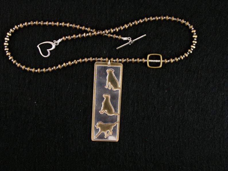 MW1871 Three sterling cut-out dogs on brass on necklace of black striped brass beads with sterling heart toggle clasp